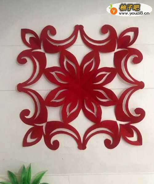 6第六步 剪完外围多余的彩纸之后 再剪里面的空白部分和镂空部分 还有其它涂实的部分等等 全部剪完之后 取开压平 一副镶边的八瓣花图案 就裁剪完成了
