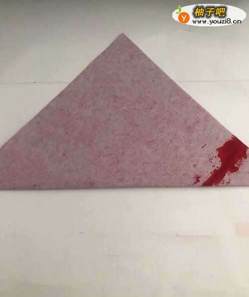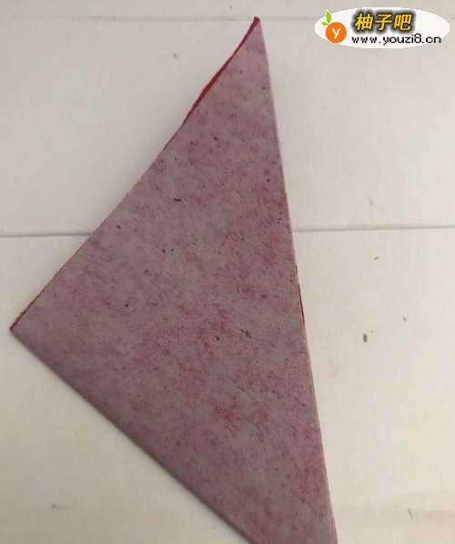 第一步 首先取一张16厘米长X16厘米宽的正方形红色彩纸 先把它从下向上对角折叠整齐