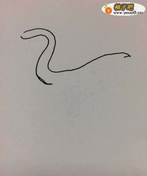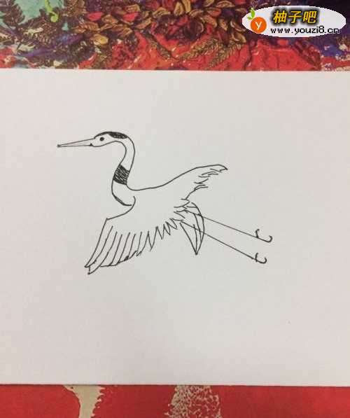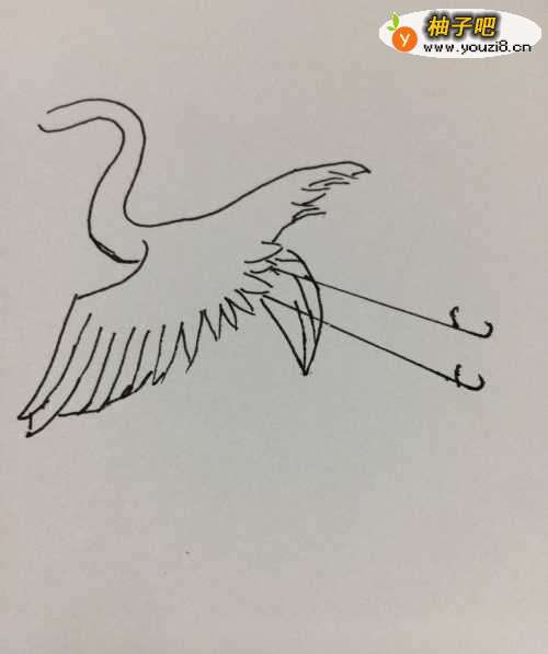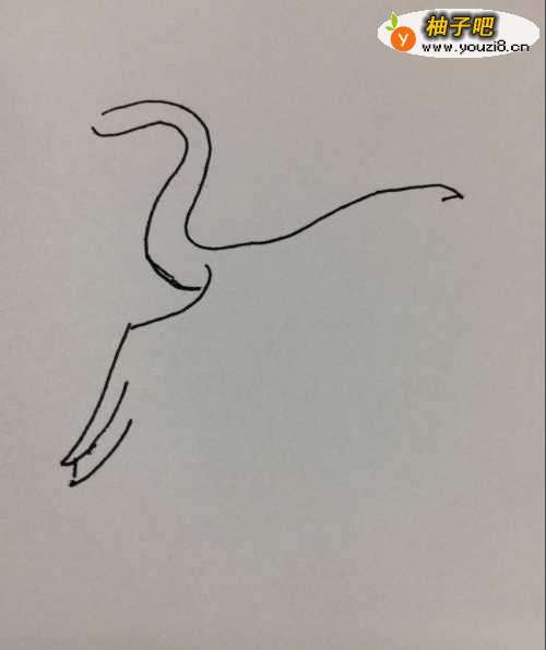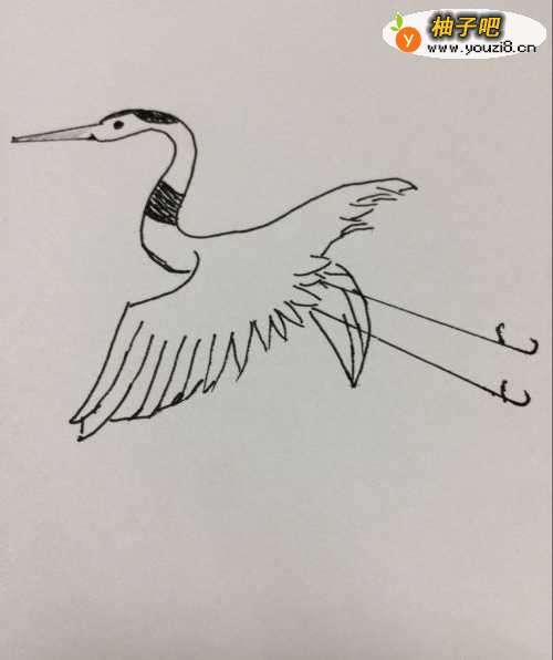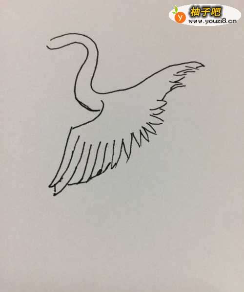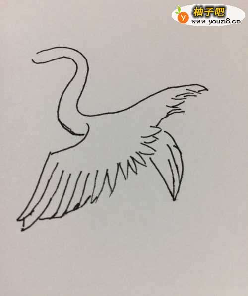 2首先画出仙鹤的脖颈和右边部分翅膀。