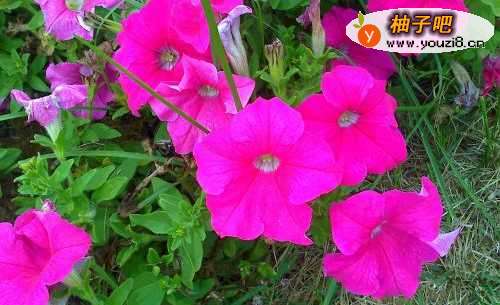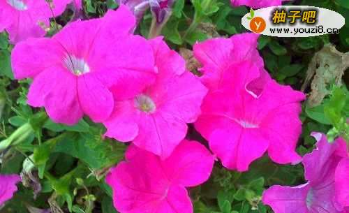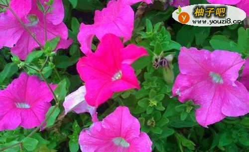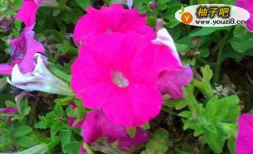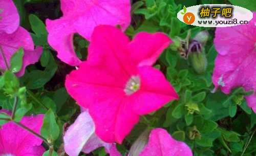 4这花丛中有浅粉色的喇叭花还有深粉色的喇叭花,你看中间的那一朵就是深粉色的喇叭花,