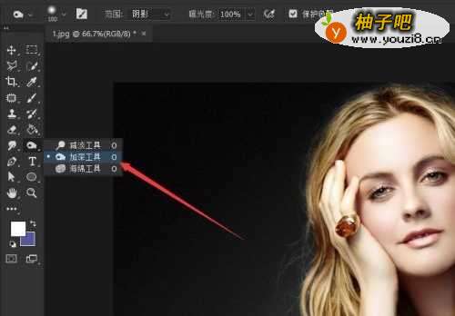 2第二步:我们在左边的工具栏中选择加深工具,一个握手的形状。这个形状很好记住吧!