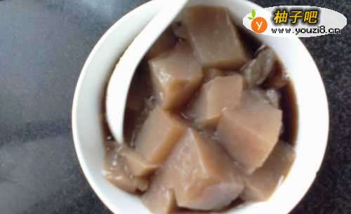 3取个盘子,把糊倒入盘中,等冷却后就像豆腐一样了,可用小刀划成小块。