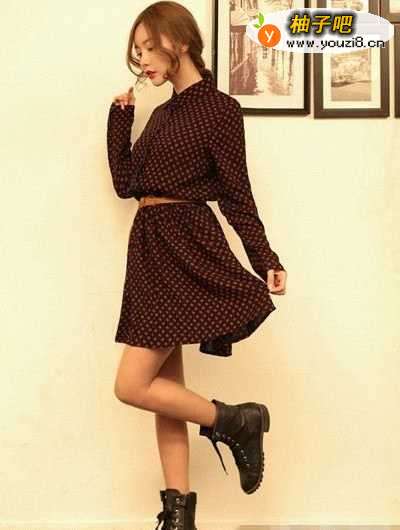 波点长袖立领连衣裙+棕色腰带+黑色短靴