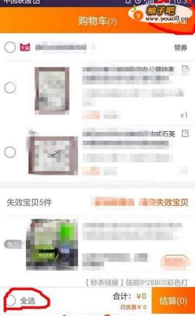 5我们点击“管理”后,我们可见到购物车里的所有商品前都有空心的圆圈,在该页面左下方我们能看到有“全选”字样;