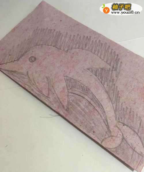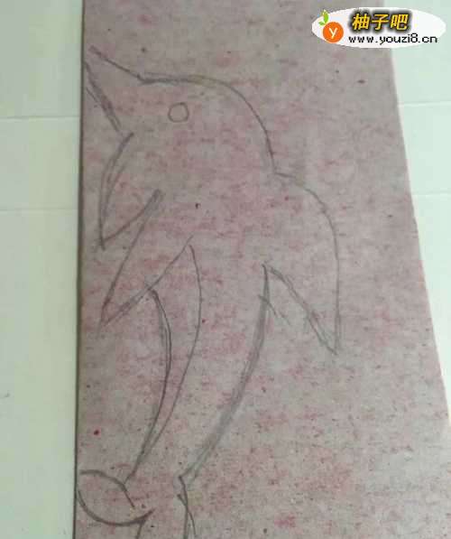 2第二步 对边折叠好之后 再把它竖起来 双边再左 然后拿起绘图铅笔画上海豚的头部和身子的外线草图轮廓