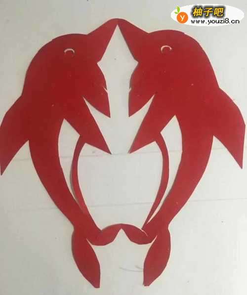 6第六步 剪完外围多余的彩纸之后 再剪出它的眼睛 嘴巴 胸鳍 背鳍 尾鳍 肚底处的镂空部位等等 都剪好之后 展开压平 一对可爱的小海豚就裁剪完成了