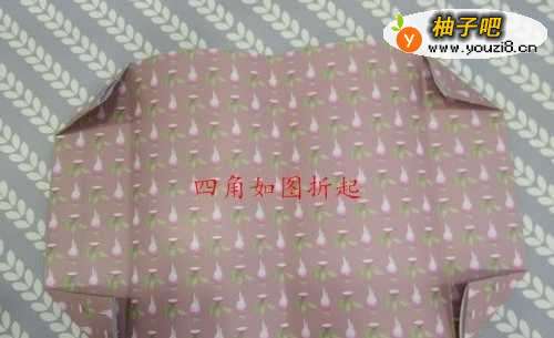 6沿左边最近的折痕将左上边的角向折痕折叠,左下角的同样沿折痕折叠,折好后右边同样实施,四个角折起如图。此时4步骤中的多余部分折入。