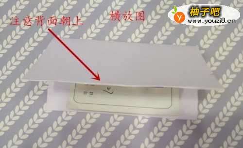 8取出书本,将整个纸张翻转过来,压平后,将书本的四个角插入纸张的四个角固定住。压平如图。