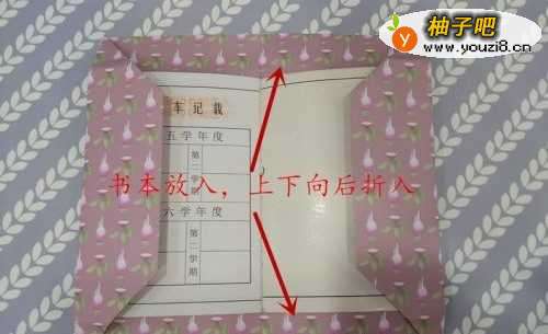 7此时将书本放入其中,两边折起往中间包住整个书本,如图。上下边缘沿书本上下边缘向后折叠。压出折痕。