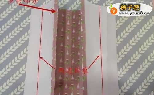 4将你的书抽出,将纸展开,会发现背面内侧会多出一部分,将两边白色部分对折后压平。同时压出折痕。