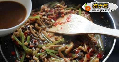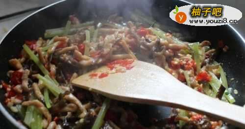 7加入莴笋丝和木耳丝,炒至莴笋丝微软。
