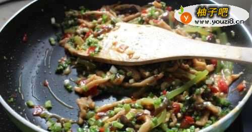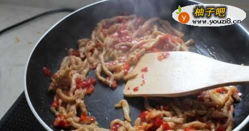 5加入泡辣椒炒出香味。