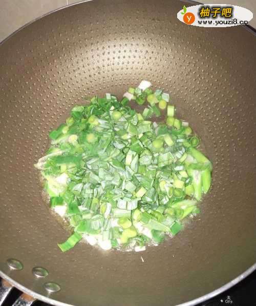 3如图,把切好的蒜苗放入锅中,翻炒两下。