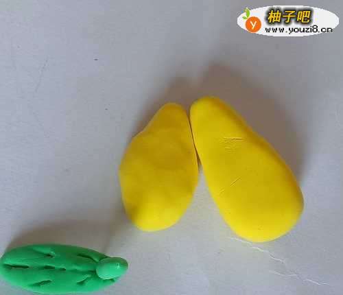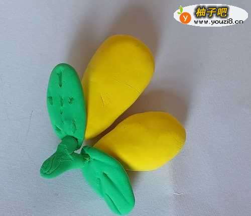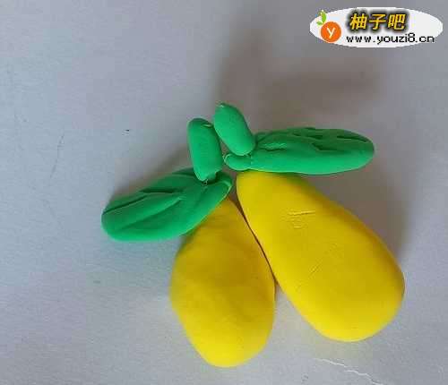 3我们把两个芒果粘在一起,然后用绿色彩泥做一片叶子