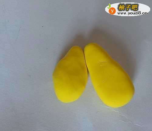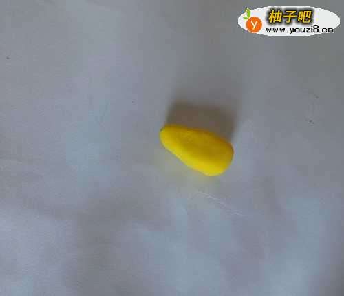我们先用黄色的彩泥做一个椭圆形,上面尖一点的芒果