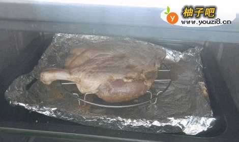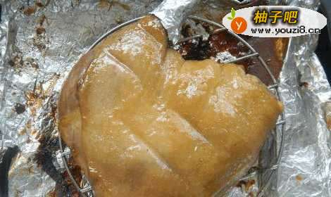 3在烤盘上垫个锡纸,放上烤网,有皮的部分先朝上,然后在鸭肉上刷层蜂蜜,200度,中下层烤15分钟。