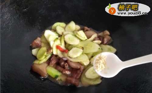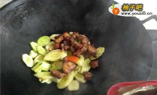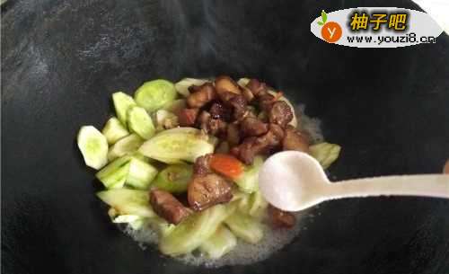 5红烧肉成品倒入锅中,和黄瓜一同翻炒。