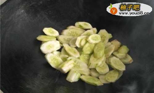 4将切好的黄瓜片倒入锅中,中火翻炒约一分钟左右。