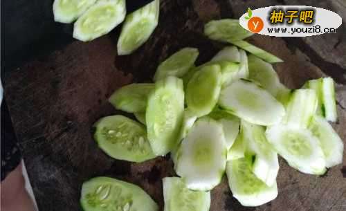 2将去皮后的黄瓜切成片状待用。