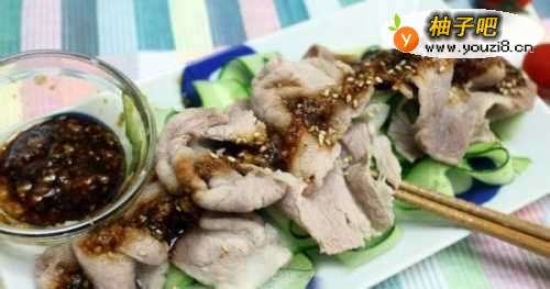 1.小黄瓜清洗干净,用削皮刀平行销薄片备用。2.大蒜用挤泥器压出来,大蒜若没有挤泥器也能手工菜刀剁碎。3.蒜泥加入酱油和生抽中和一下酱料。4.肉片滚水后快速涮烫。5.准备平盘,下面铺上小黄瓜片,上面在放上刚刚涮烫好的肉片,淋上蒜泥酱即可食用。