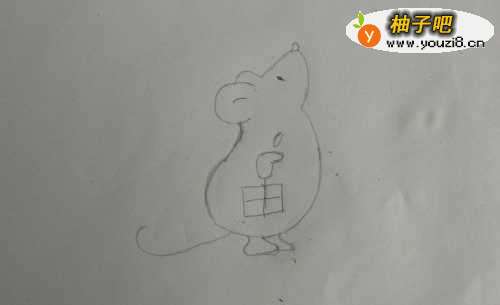 4然后我们在画上老鼠小小的眼睛,眼睛要与鼻子平行,在画上老鼠提着包的手以及包。