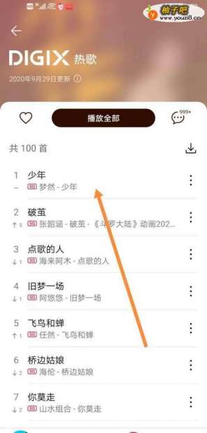 4选择要下载的歌曲:《少年》,选中点击开启歌曲播放页面