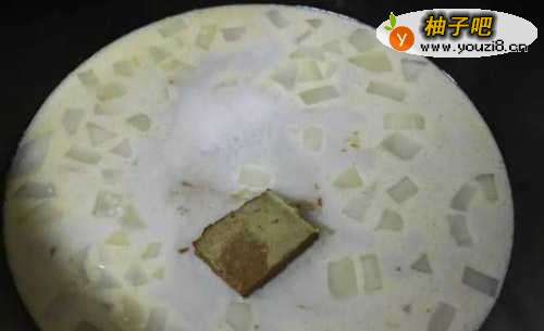 3加入椰奶稍微炒香后加入水。滚后转小火,放入绿咖喱块,搅拌均匀。
