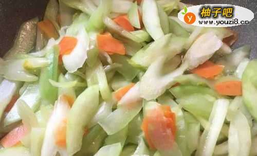 4放入大黄瓜、西洋芹、红萝卜翻炒几下,加入半米杯的水