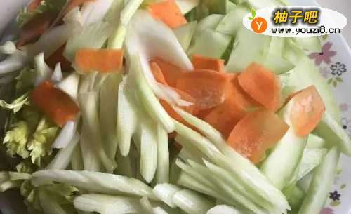 黄瓜去皮去籽切片,西洋芹斜切片,红萝卜切片
