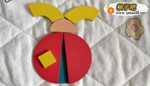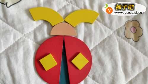 8在右侧半圆的上面,放上一个黄色正方形,如图。小瓢虫就出来了。