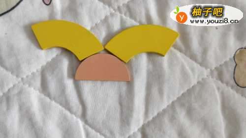 3在上面,放上两个左右排列的黄色弧形,如图。