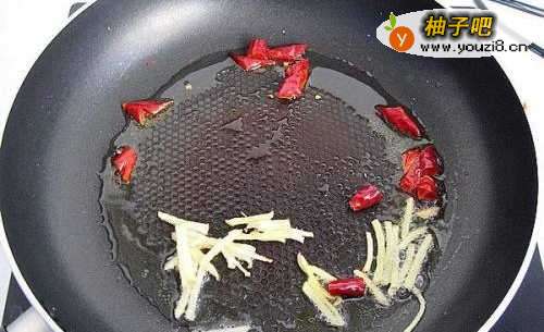 6锅烧热后放油,炒香姜丝和干辣椒