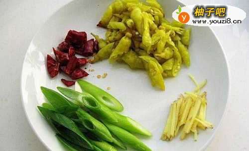 5泡椒切段;姜切丝;葱切段;干辣椒剪成段