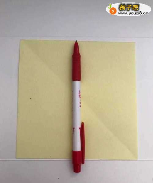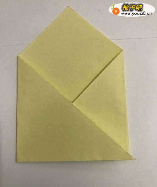 第一步 取一张边长16厘米的正方形黄色彩纸 从下向上对角折叠 然后再拿起右边角向左边三分之一的地方折 拿起左边角向右三分之一的地方折叠