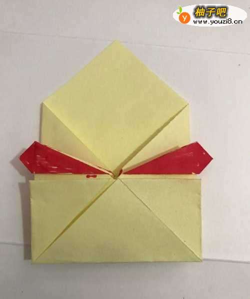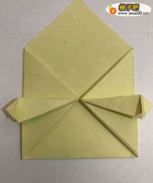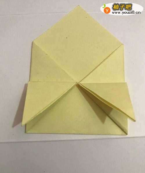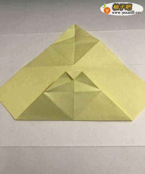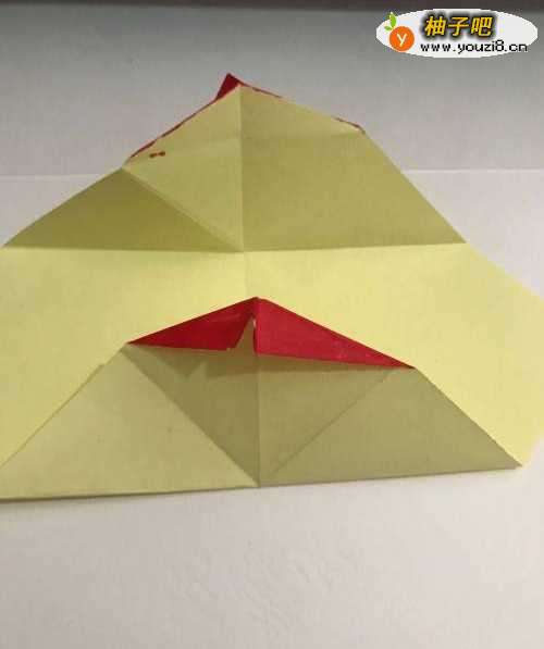 7第七步 下角向上吻合折倒之后 再掀起下边向上对折至红唇下边 折后翻上去 然后左右两个角都向下折倒