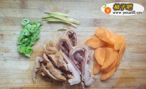 胡萝卜切片、姜切丝、葱切末,然后切一些猪肚备用。