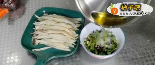 3等杏鲍菇蒸好后,凉一会,然后用手撕成条。起锅烧油,将热油浇在料汁上;