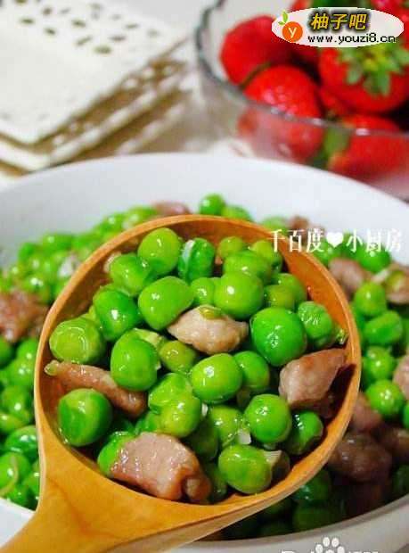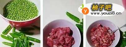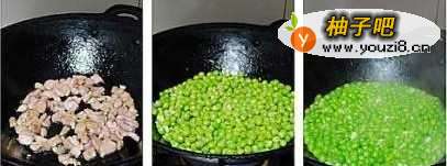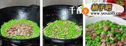 6至青豆将熟,倒入肉粒翻炒至熟。