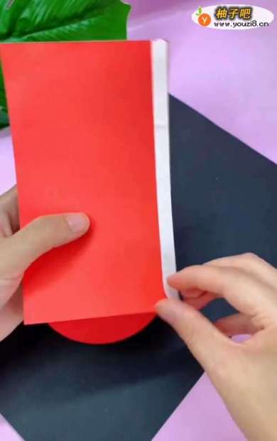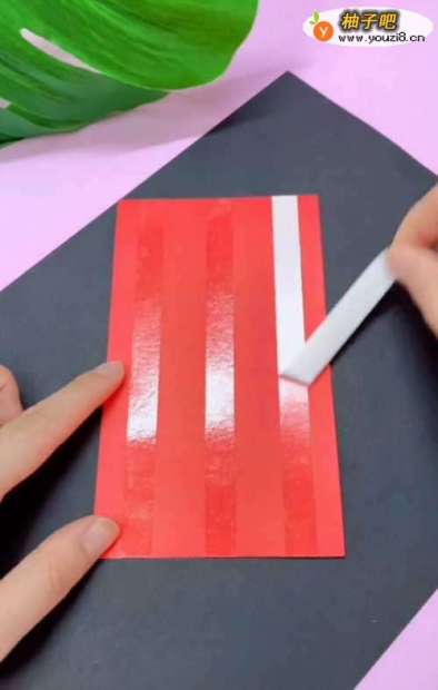 找一张长方形的红色剪纸,依次贴上三道双面胶;