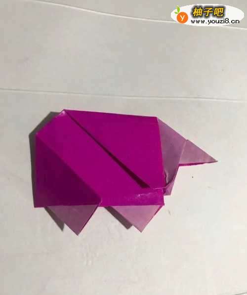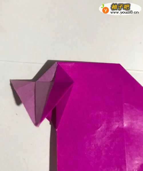 10第十步 两边的小绵羊蹄子对齐折好之后 再把上边向下 大约在小绵羊的天灵盖处向下折叠 然后再把左右翻过来调整一遍 一只漂亮可爱的小绵羊就折叠完成了