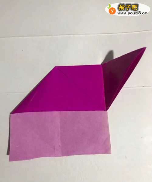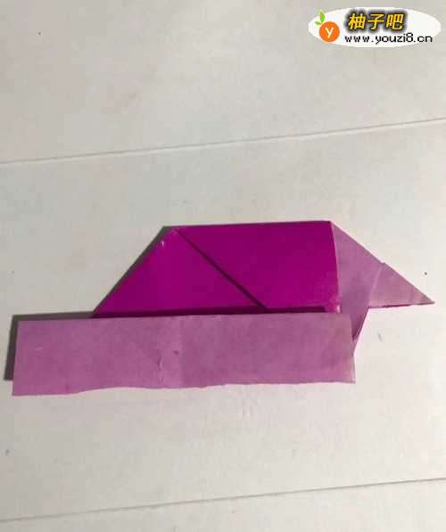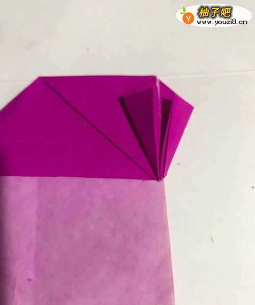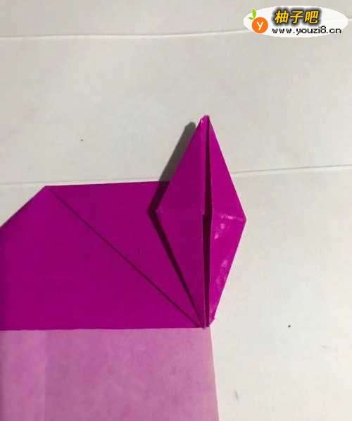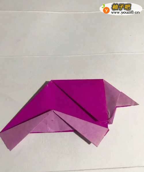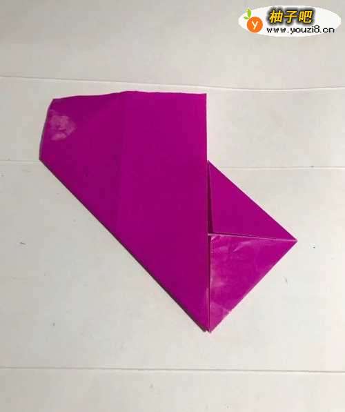 8第八步 折好之后 粉色当中的小中线上头至左下角向下折叠 然后右下角至小中线上头也向下折