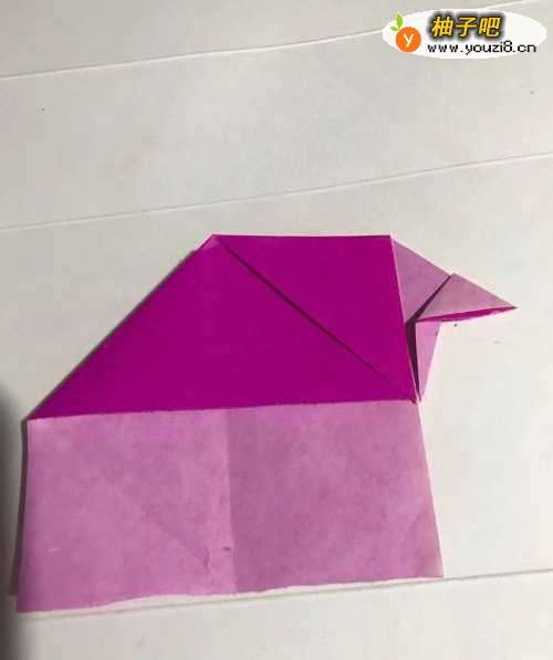 7第七步 两边的耳朵都折好之后 再把小绵羊的嘴部向上折至里面 然后把它的头部翻到背面 再把下面的长方形向上对齐翻折 单页向下对齐回折