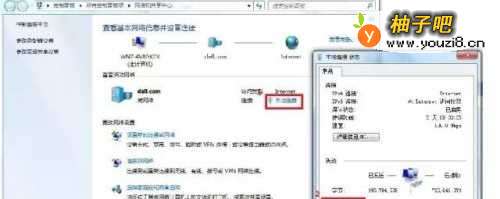 右下角电脑图标,右键选择网络和共享中心;点击本地连接弹出本地连接状态,然后选择属性。