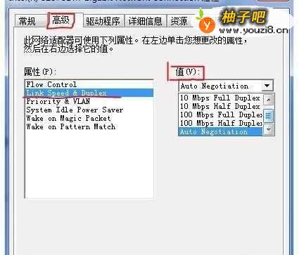 6步骤三:在高级下选有SPEEDAND DUPLEX字样的选项,把右边“值(V): “的这列启用,所有的先项都试一下,看网络是否能稳定下来!