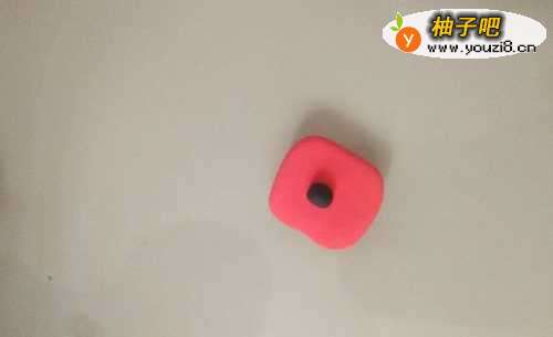 5用红色橡皮泥做个圆形,再把它按扁。再在中间粘一个黑色的圆形。作为锅盖。见下图