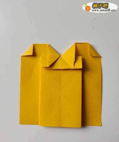 5下册左右两大角角沿中线向中间对折,上侧的左右两角沿折痕折出两个小脚
