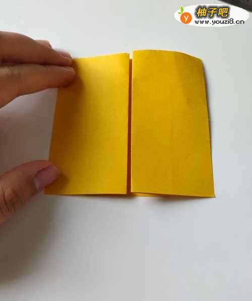 将纸横着平放在桌面上。沿竖直方向的中线对折,折出折痕后启用,翻面。