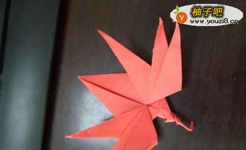 6最后将背面的一片向下折,拧成枫叶的杆就能了