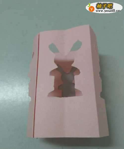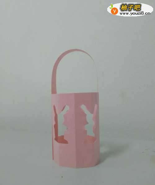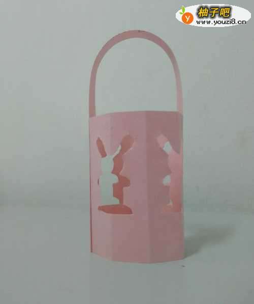 11将长条彩纸两端抹上胶棒,粘在灯笼上方的内侧,中秋节小兔子灯笼就做好了,灯笼上有四只可爱的小兔子。