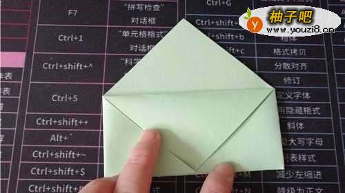 2再把左右两侧的角向上折,如图一。启用后,再把左右两侧的角向着底边的中点翻折,如图二。